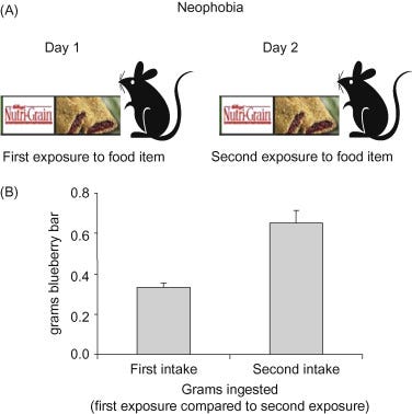 An experiment was run on lab Rats, where they were put in an enclosed environment and were offered blueberry bars which were an unfamiliar snack to Wild Rats.